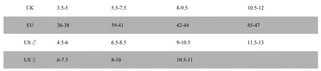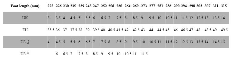 7. Salīdzini iegūto lielāko garumu ar mūsu izmēru tabulu, lai atrastu pareizo apavu izmēru.